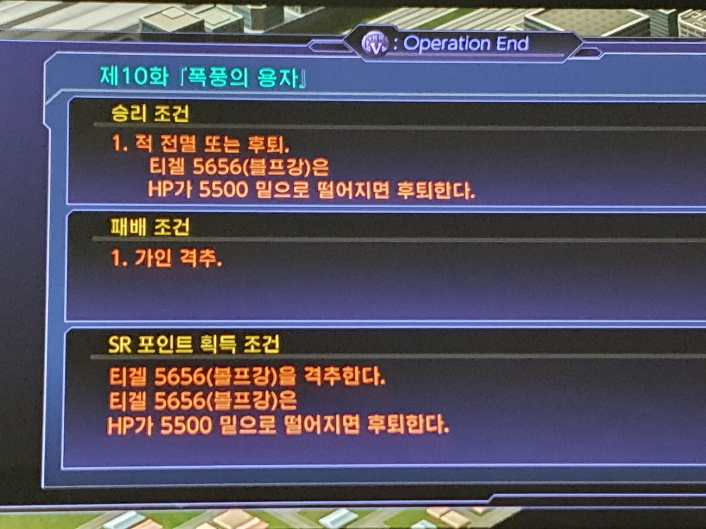 - SR 포인트 조건: (티겔 5656을 격추한다. 티겔 5656은 HP가 5500 밑으로 떨어지면 퇴각한다.)