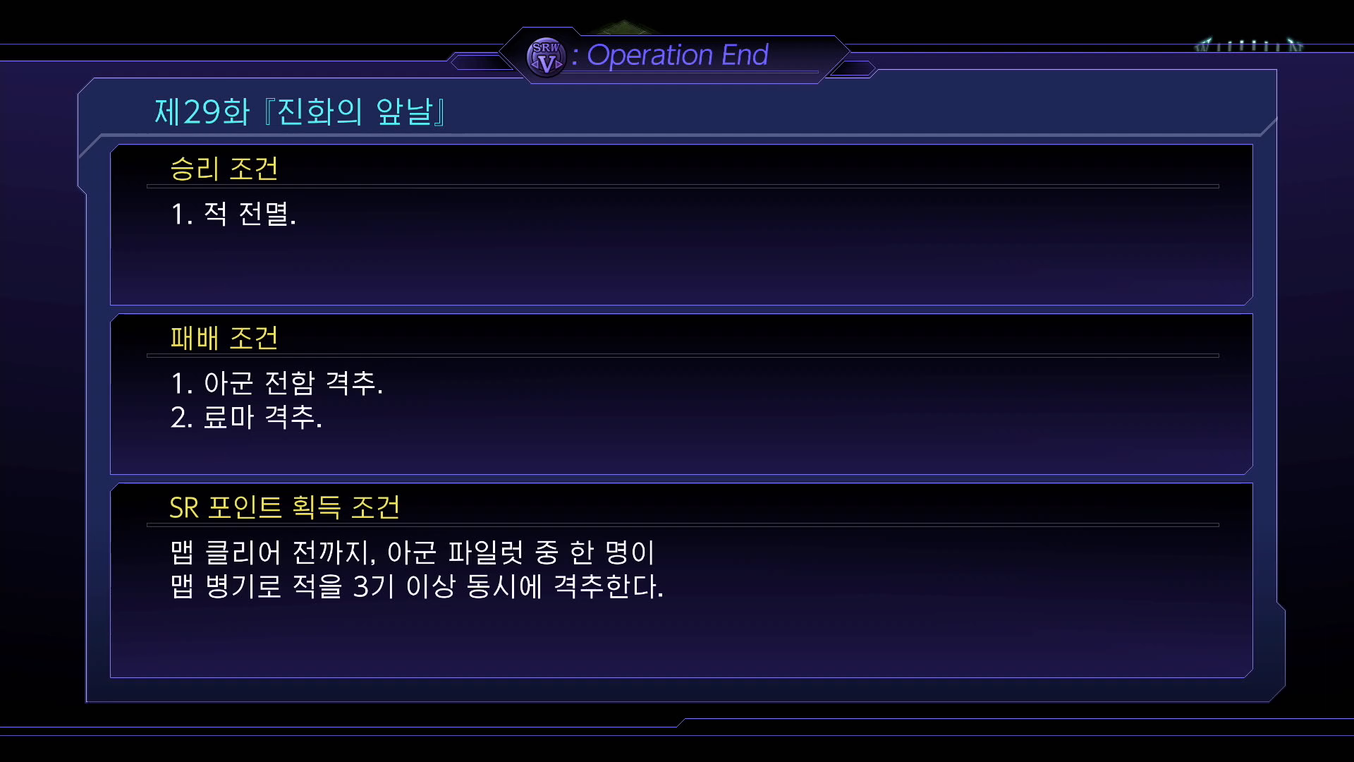 • SR 포인트 조건: (맵 클리어 전까지, 아군 파일럿 중 한 명이 맵 병기로 적을 3기 이상 동시에 격추한다.)