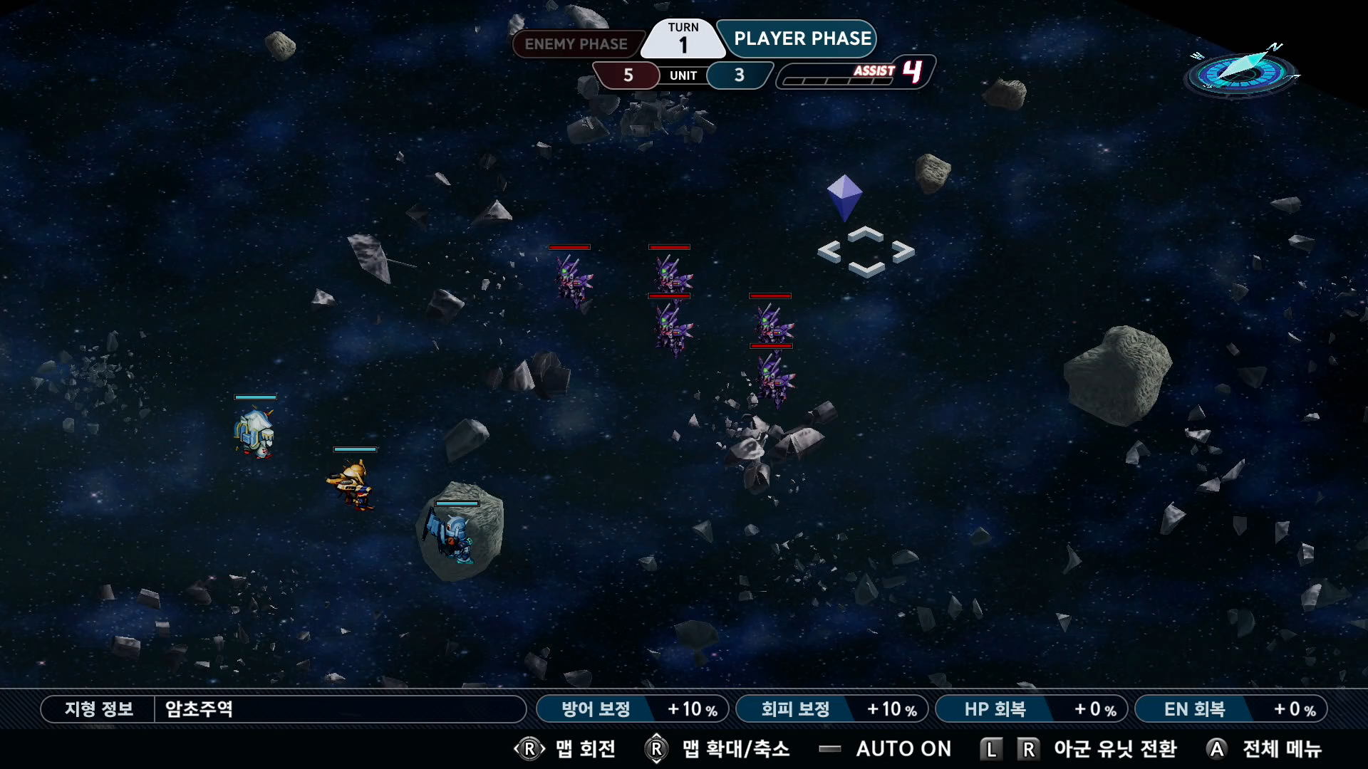 이번 미션은 심플하게 단 아군 1기로 적군 6기를 3 턴까지 모두 격추하면 됩니다.
