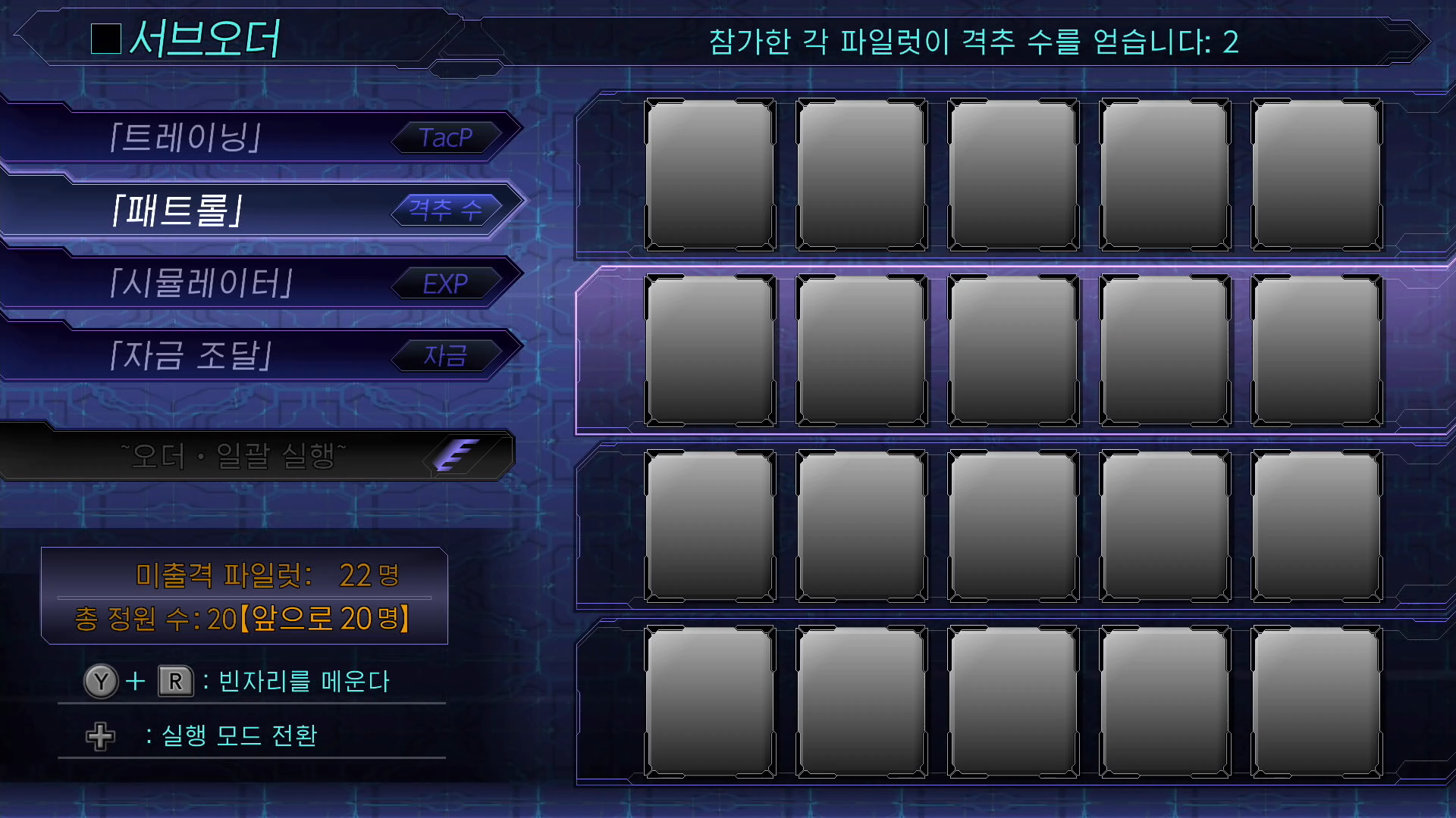 트레이닝은 TacP 획득, 패트롤은 격추수 2기 획득, 시뮬레이터는 레벨업 경험치, 자금 조달은 인당 5000이 들어옵니다.